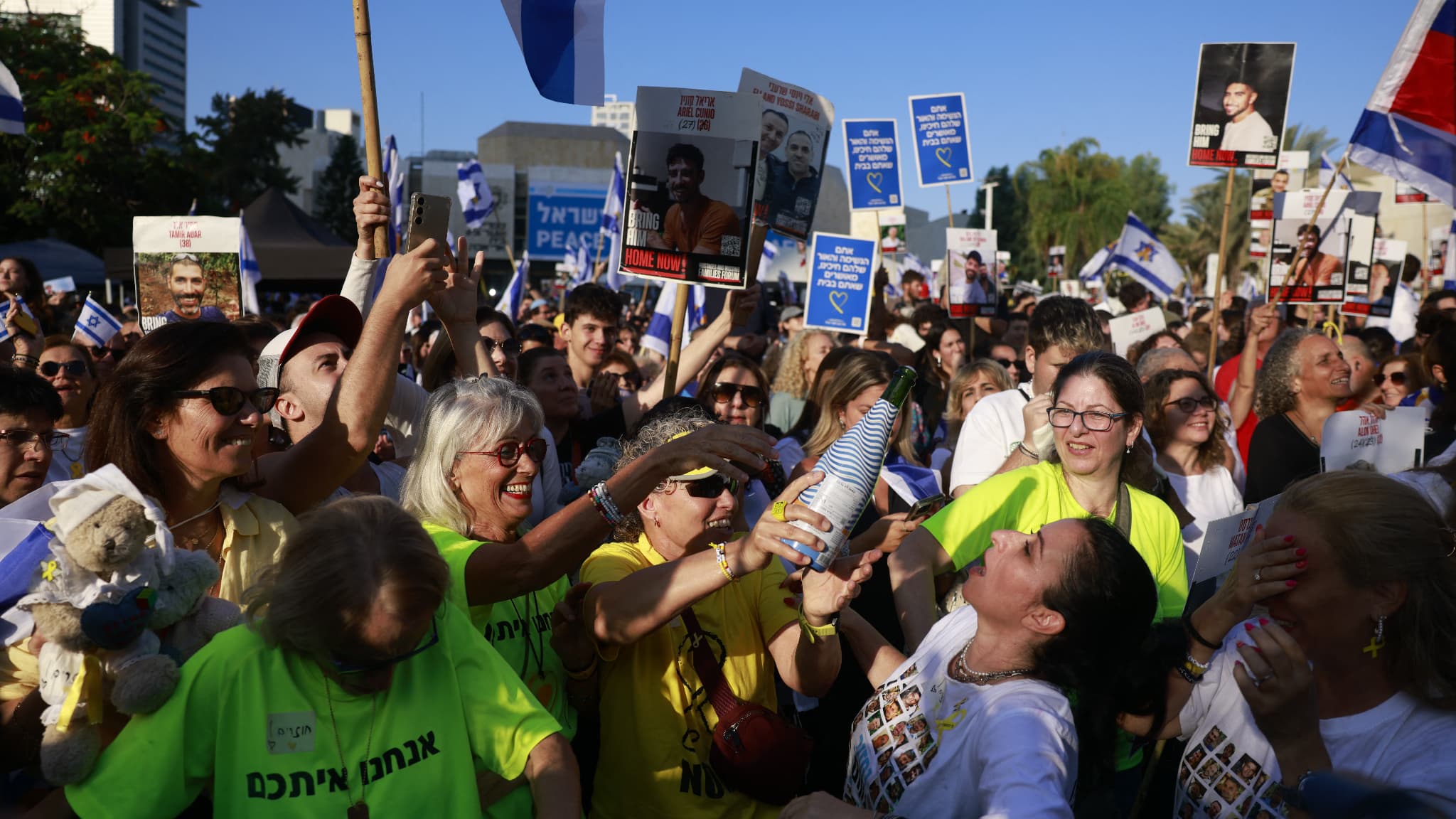 À l’annonce de la libération des premiers otages, des applaudissements et des cris de joie ont éclaté place des Otages, à Tel Aviv. Certains avaient le visage grave, d’autres souriaient, beaucoup s’étreignaient alors que résonnait la chanson Habayta (« à la maison », en hébreu), en boucle dans les haut-parleurs.