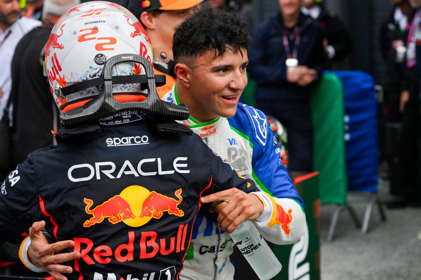 Isack Hadjar (de face) et le pilote de l’écurie Red Bull Yuki Tsunoda, lors du Grand Prix des Pays-Bas, à Zandvoort (Pays-Bas), le 31 août 2025. JOHN THYS/AFP