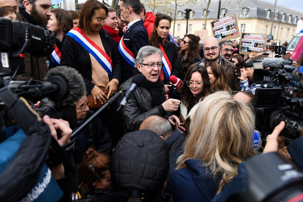 Le leader de La France Insoumise (LFI), Jean-Luc Mélenchon, s’adresse à la presse lors d’une manifestation organisée à Paris le 6 avril 2023. ALAIN JOCARD / AFP