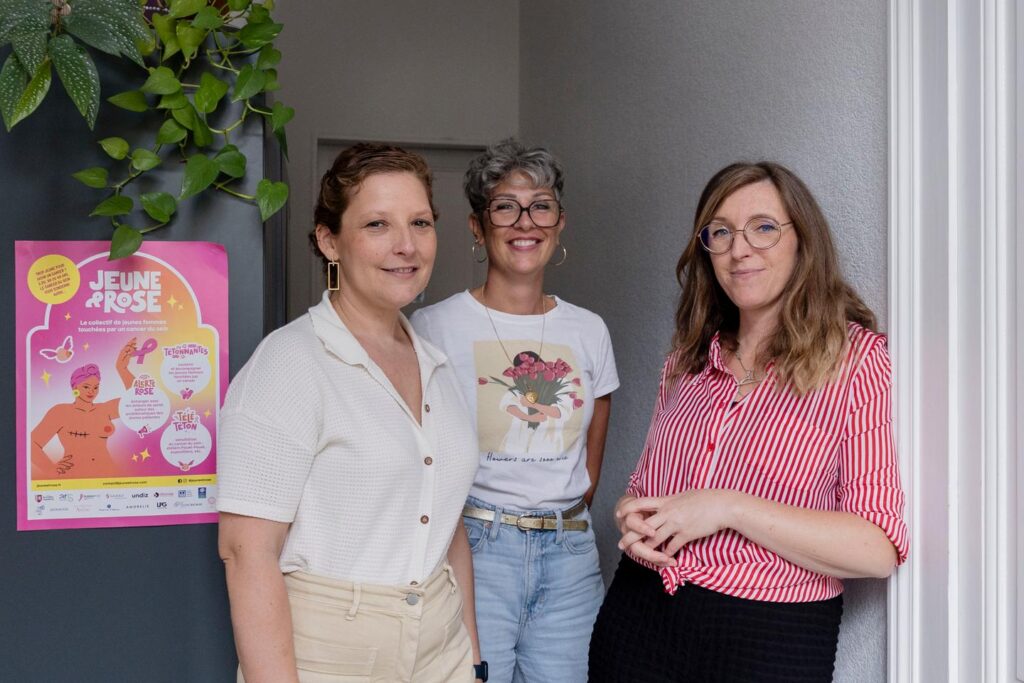 De gauche à droite : Johanna Vios, responsable de la formation dans une banque, Laëtitia Morteau-Mallet, responsable des bénévoles de l’association Jeune & Rose, et Mélanie Courtier, cofondatrice et directrice de Jeune & Rose, dans les locaux de l’association, à Saint-André-de-Cubzac (Gironde), le 22 septembre 2025. MARLENE AWAAD POUR « LE MONDE »