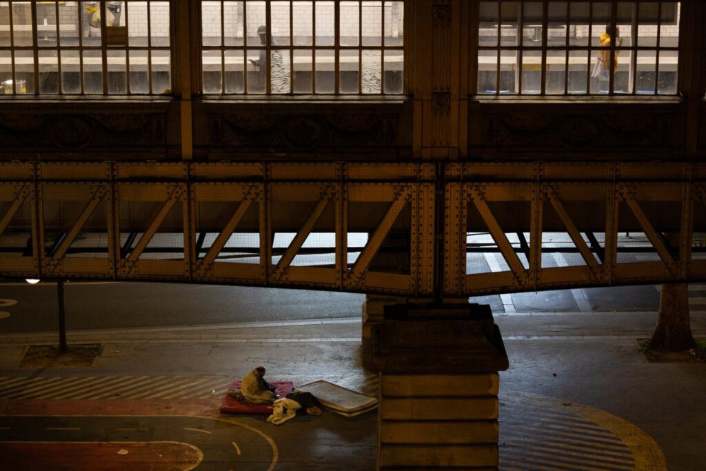 Une personne sans-abri, installée sous une ligne de métro aérienne à Paris, le 21 septembre 2025. JOEL SAGET/AFP