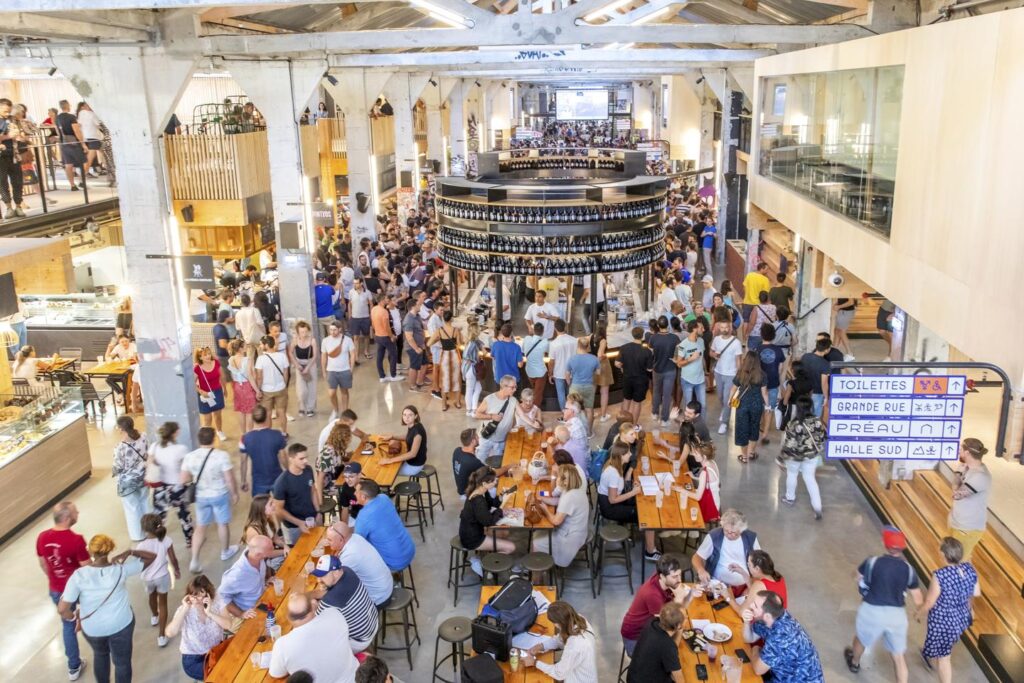 Sur la terrasse du Beau Marché, un food hall situé dans le centre de Bourg-en-Bresse, chaque détail doit mettre à l’aise le client, des parasols de couleur crème aux lustres en osier en passant par les plantes suspendues et l’olivier trônant dans un immense pot. Chacun peut choisir son assise, chaises multicolores ou tabourets encadrant des mange-debout, voire s’affaler dans un canapé cosy. Le niveau assourdissant de la musique sera toutefois le même pour tout le monde. A l’intérieur de ce bâtiment ouvert sept jours sur sept jusqu’à 1 heure du matin, autour de l’imposant bar, des cuisiniers s’affairent dans des stands de quelques mètres carrés, proposant des spécialités thaïes ou italiennes, des sushis ou viandes du « butcher ». La commande se fait au comptoir, où le client reçoit un bipeur, qui sonnera lorsque son repas sera prêt. Un poissonnier, dont l’enseigne, Bande de maquereaux, s’affiche en blanc et bleu, et un « bar à fromages », complètent l’offre.