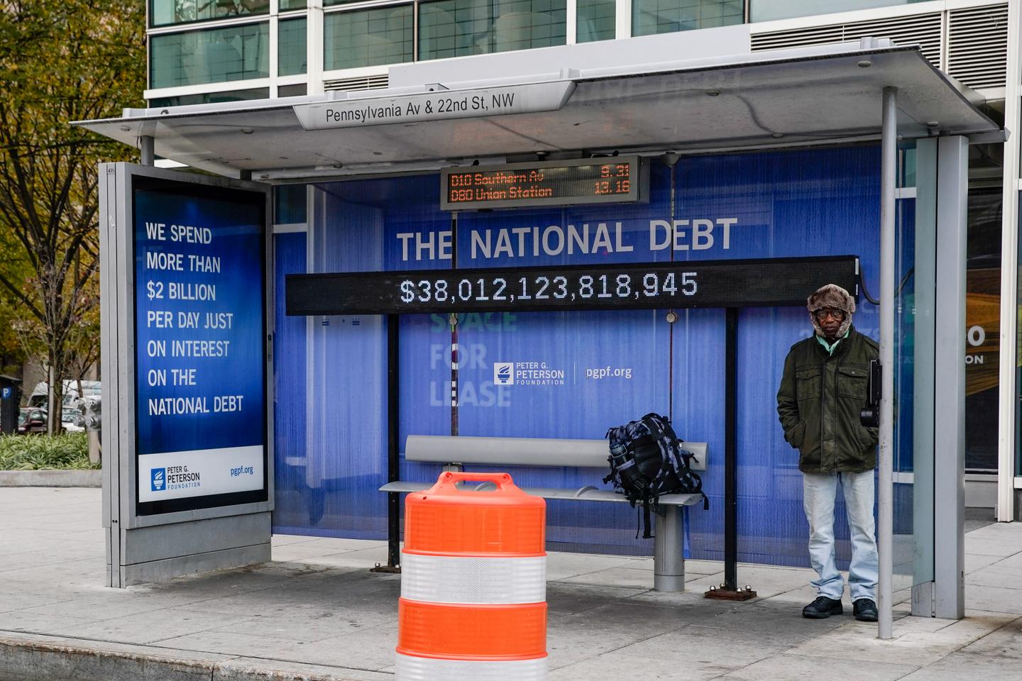 Vue d’un abribus où est affichée la dette nationale américaine, par habitant et pour l’ensemble du pays, à Washington, le 28 octobre 2025. JEMAL …
