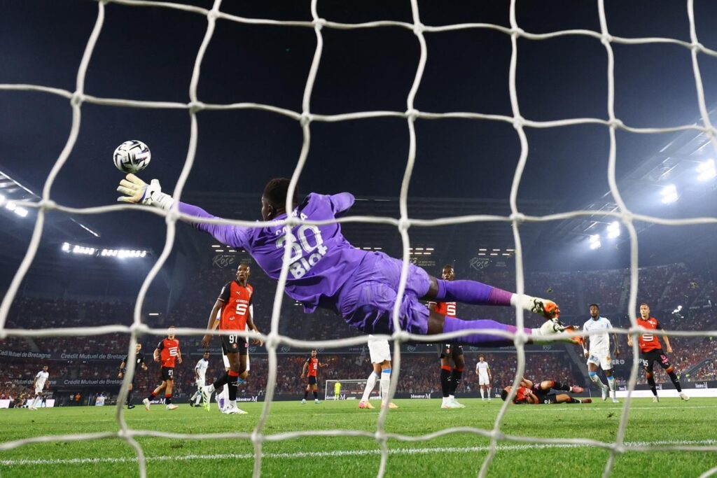Le gardien de Rennes, Brice Samba, dans le match opposant l’équipe à Marseille, au Roazhon Park de Rennes, le 15 août 2025. STEPHANE MAHE/REUTERS