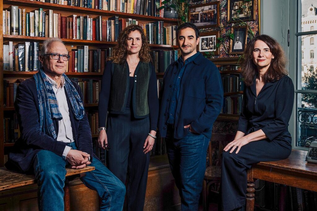 De gauche à droite, les éditeurs Francis Geffard (Albin Michel), Tiffany Gassouk (Gallimard), Joachim Schnerf (Grasset) et Raphaëlle Liebaert (Stock), à la librairie Shakespeare and Company, à Paris, le 5 mars 2025. LUCAS BARIOULET POUR M LE MAGAZINE DU MONDE